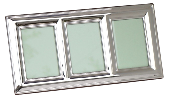 The frame features three individual apertures, each measuring 3.75 x 2.75 inches (9.5 x 6.5 cm), with an overall frame size of 11.5 x 5.75 inches (29.5 x 14.5 cm). Its 2.5 cm wide plain polished border gives it a luxurious and substantial appearance, while still keeping the design simple enough to suit almost any room.